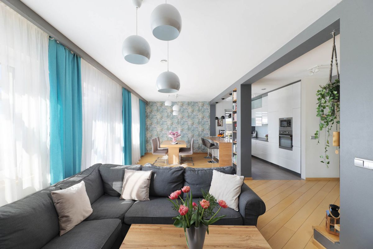 • salon z wyjściem na ogród,