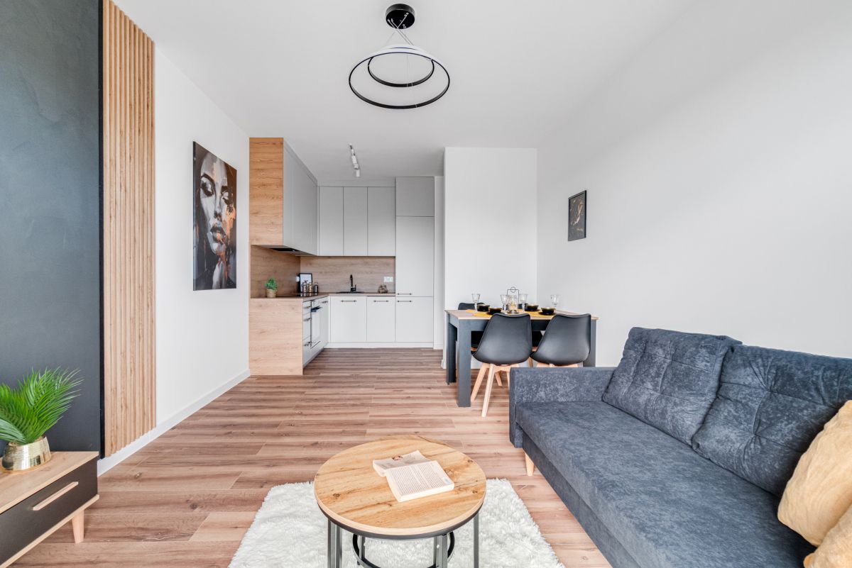 • przestronny salon z wyjściem na balkon z aneksem kuchennym,