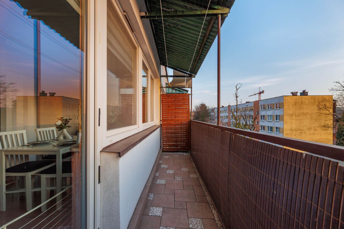 Do mieszkania przynależy również balkon oraz piwnica o powierzchni ok. 5 m², która zapewnia dodatkową przestrzeń do przechowywania.