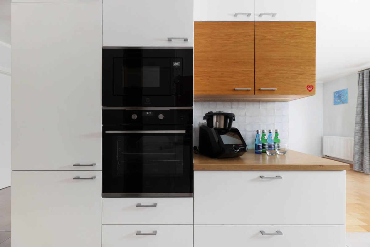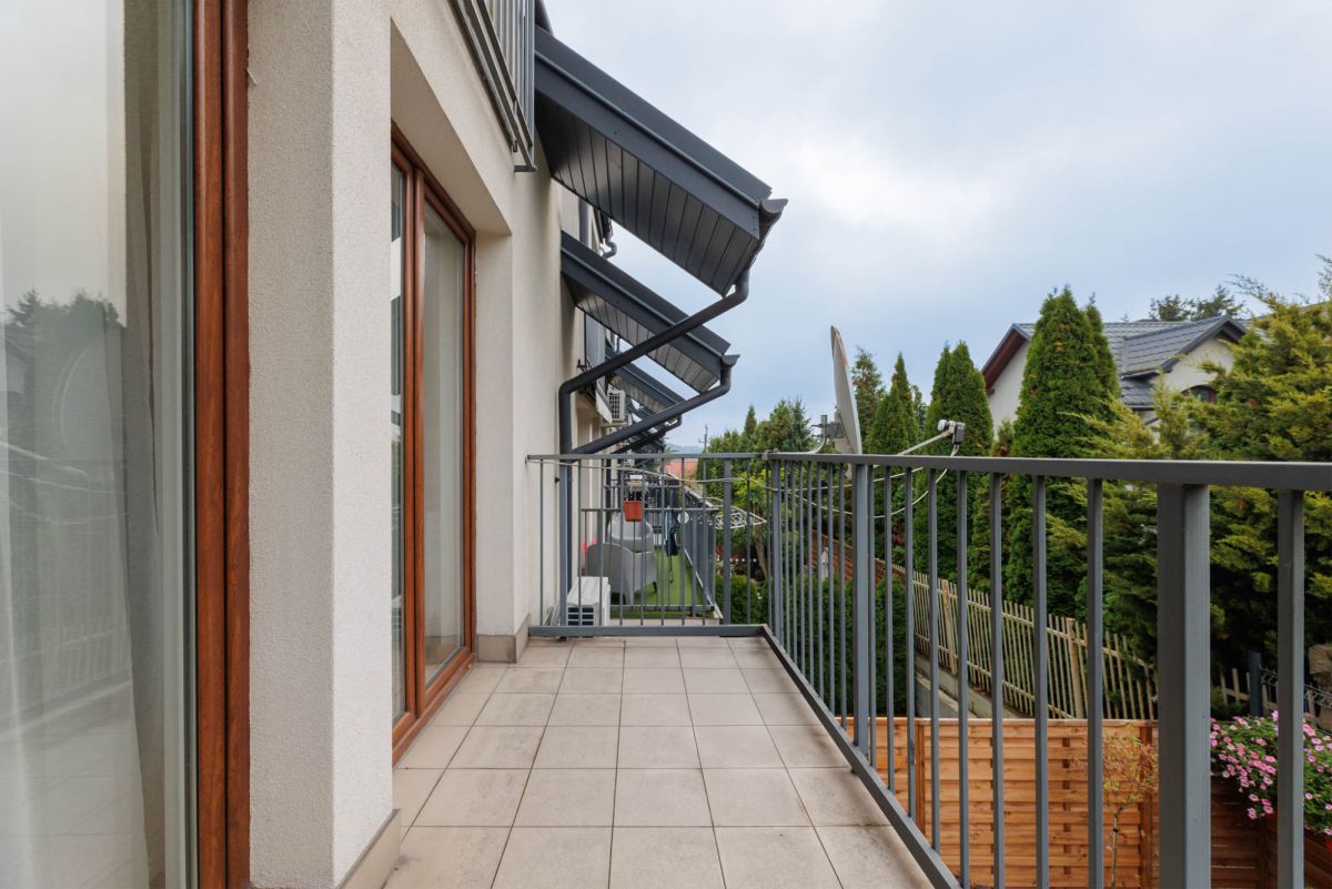 Do mieszkania przynależy balkon z ekspozycją południową, z widokiem na zieleń oraz elektryczną markizą przeciwsłoneczną, garaż w bryle budynku w cenie 60 000 zł, z możliwością dokupienia drugiego garażu w sąsiednim budynku również za 60 000 zł. Mieszkanie jest wyposażone w klimatyzację na dwóch poziomach oraz ogrzewanie podłogowe z indywidualnym sterowaniem w każdym pomieszczeniu.