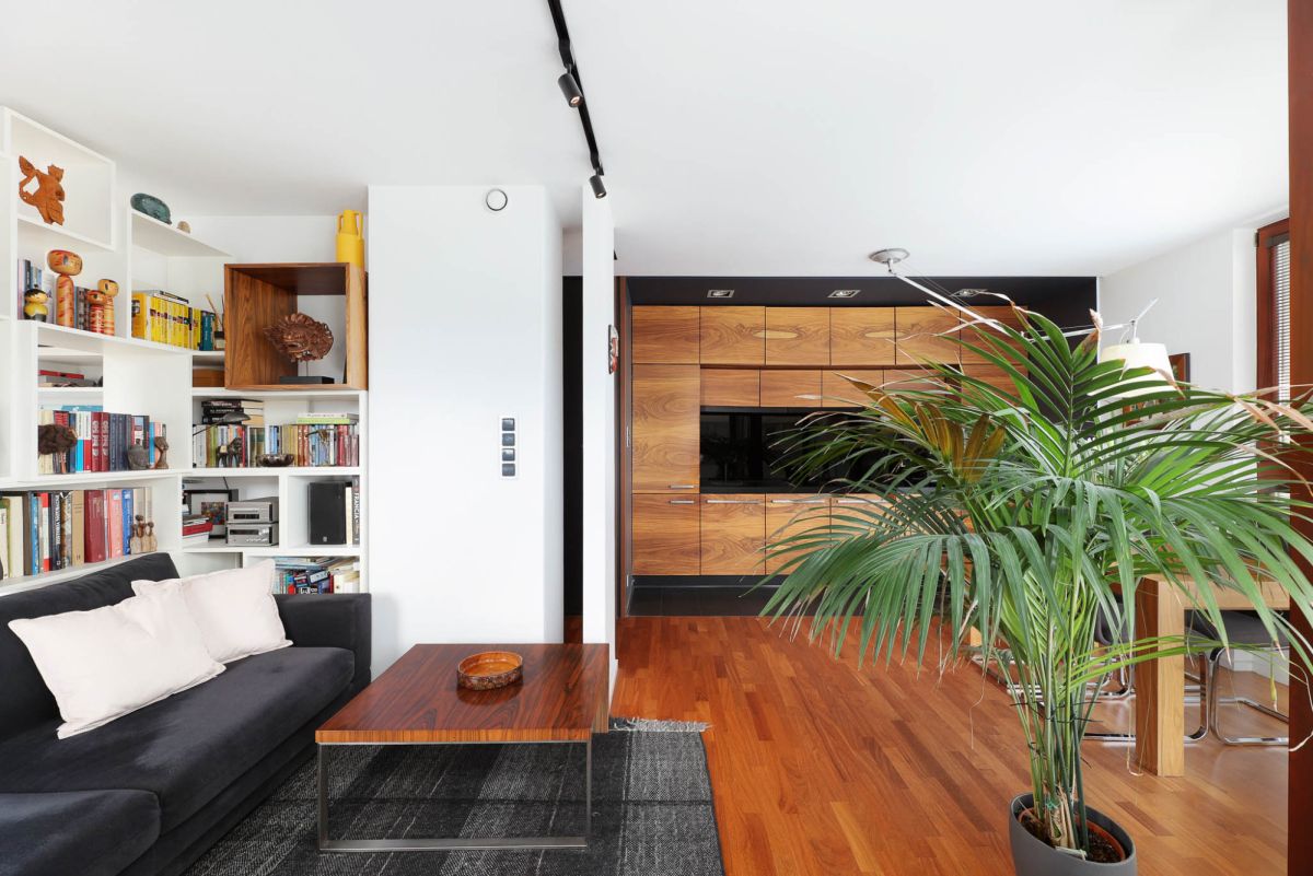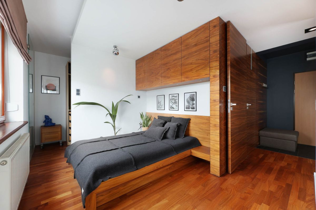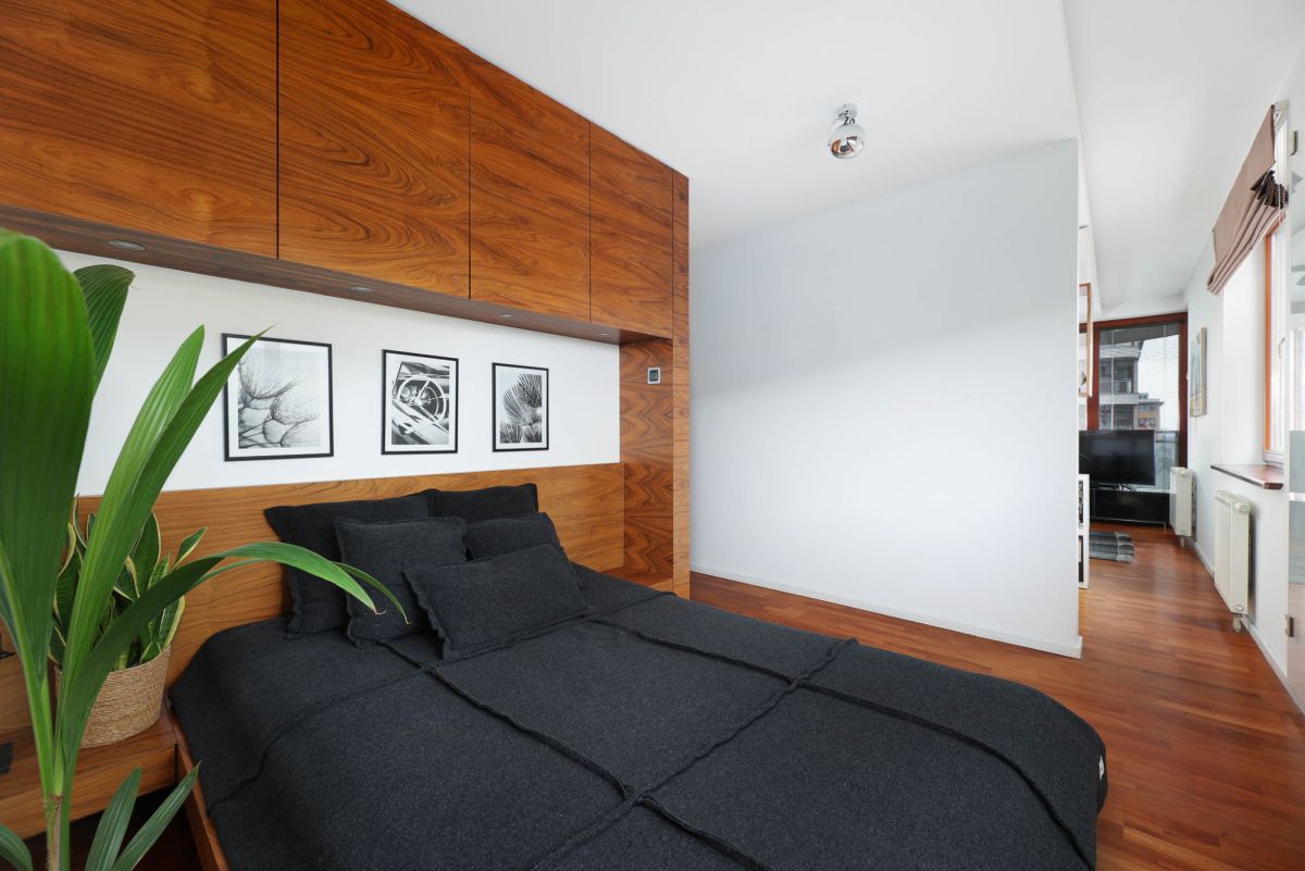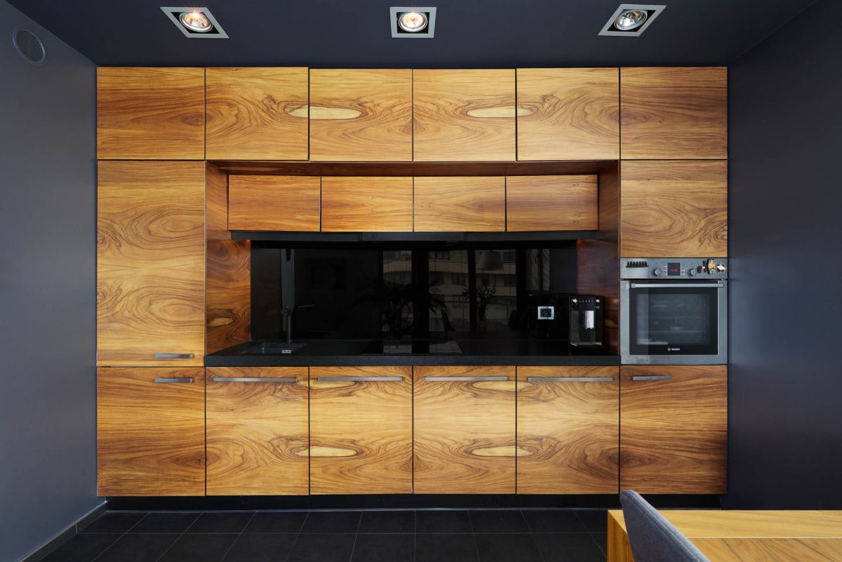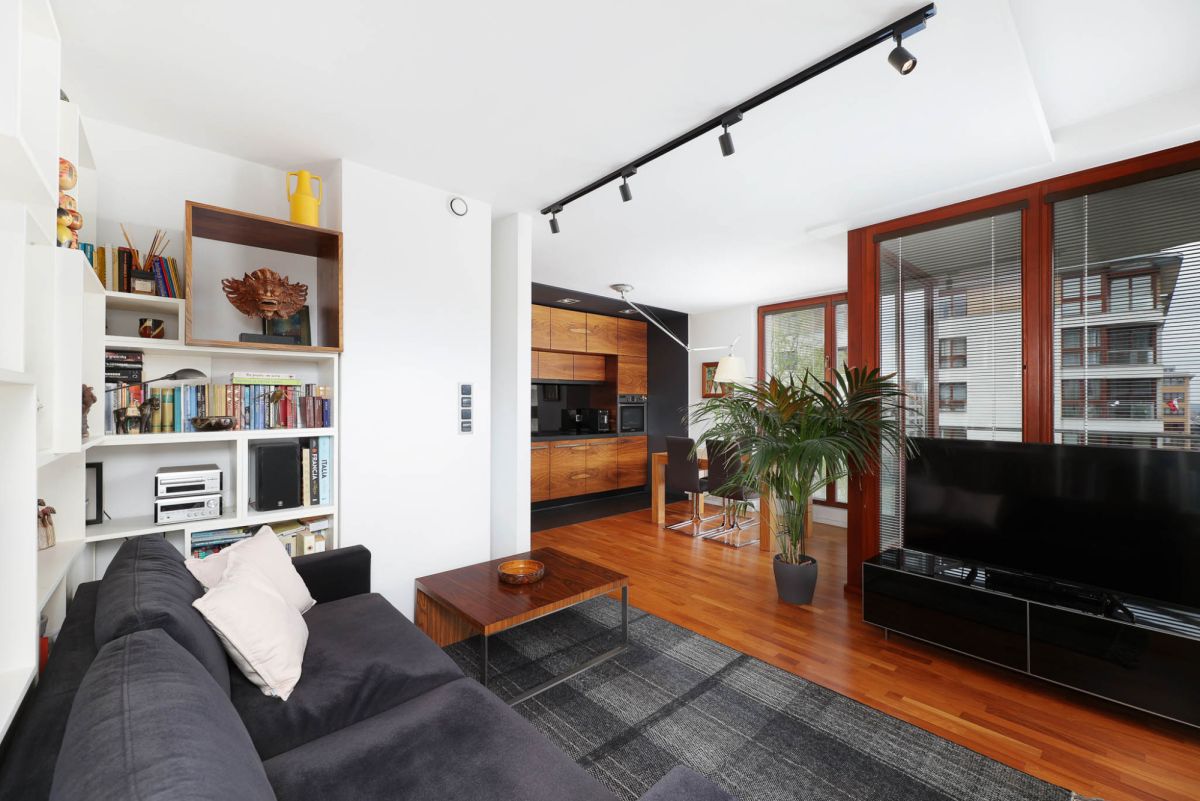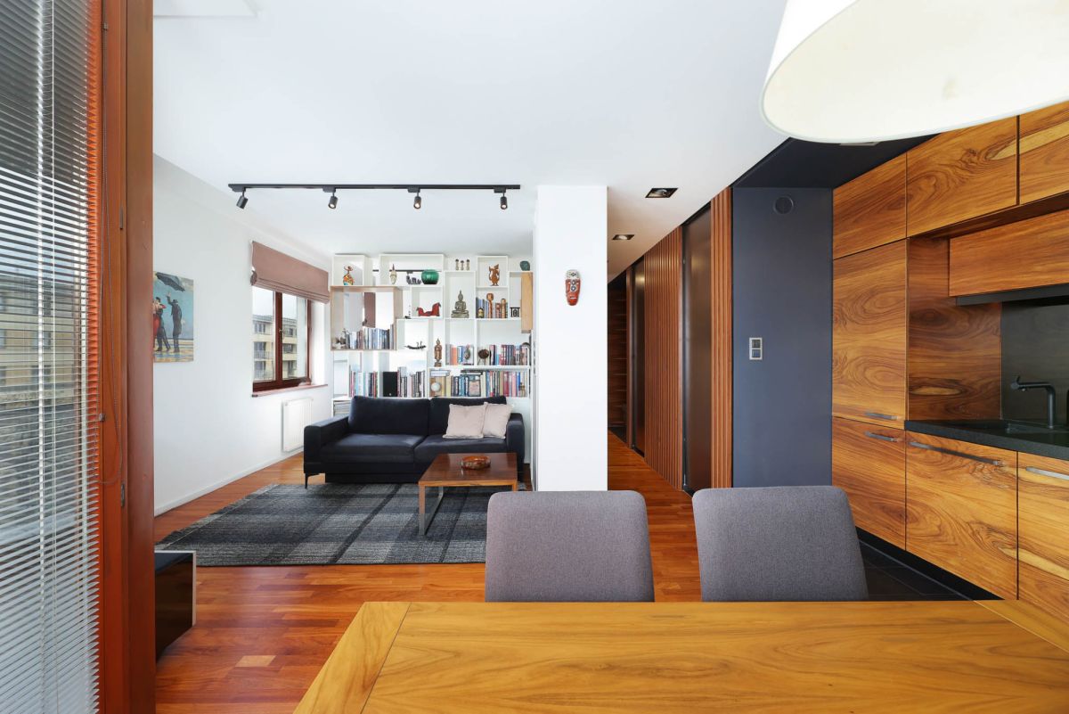 Wnętrze zostało wykończone w podwyższonym standardzie, z dbałością o jakość materiałów. W części kuchennej zastosowano blat z ciemnego granitu, a cała zabudowa została wykonana na wymiar z wykorzystaniem forniru palisandru indyjskiego. Na podłogach znajduje się drewniana podłoga Barlinecka, co nadaje wnętrzu elegancki i ponadczasowy charakter.