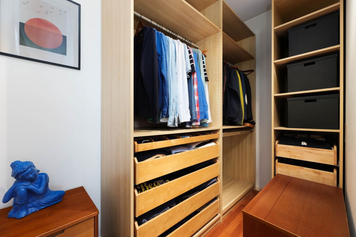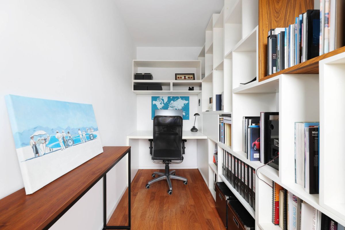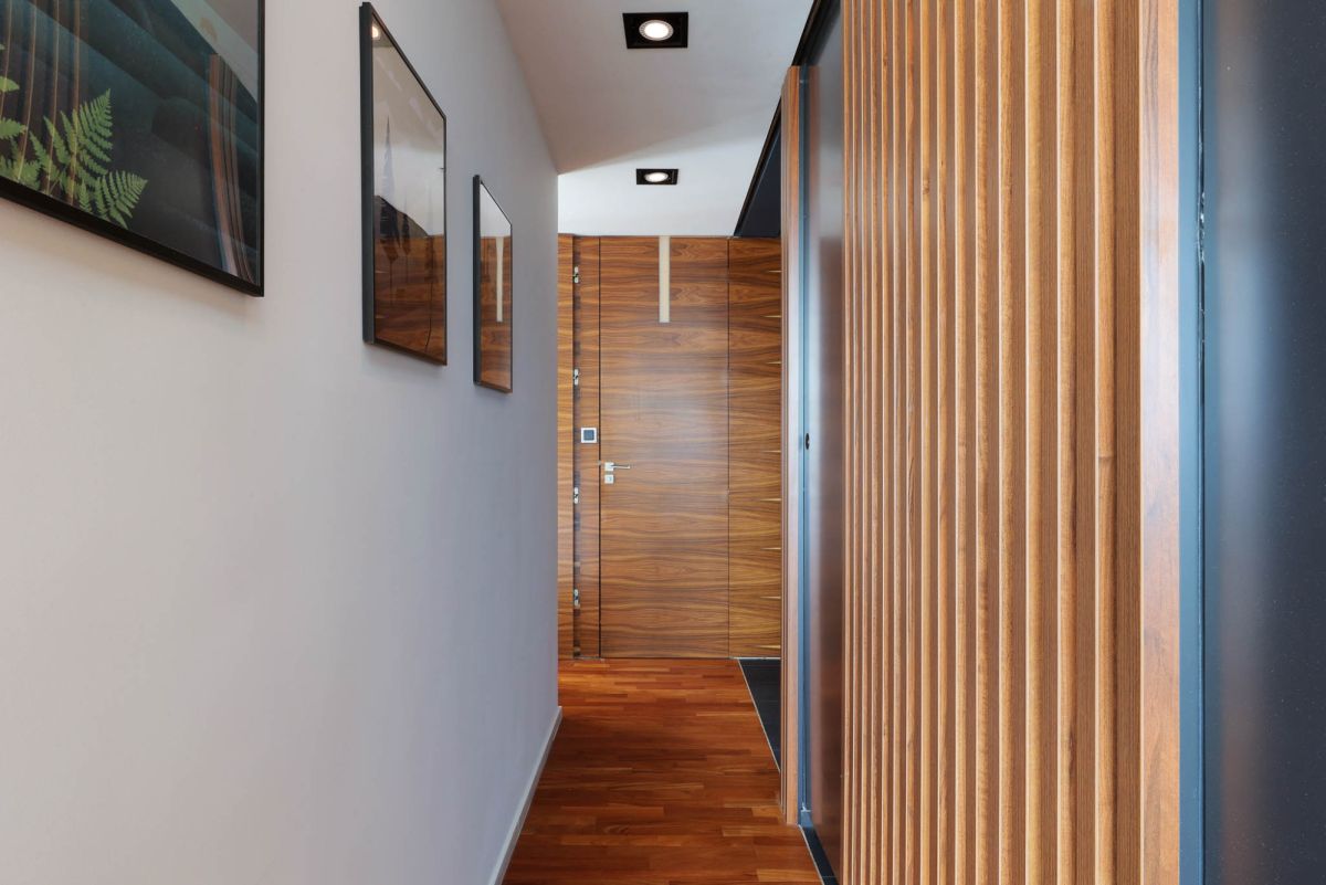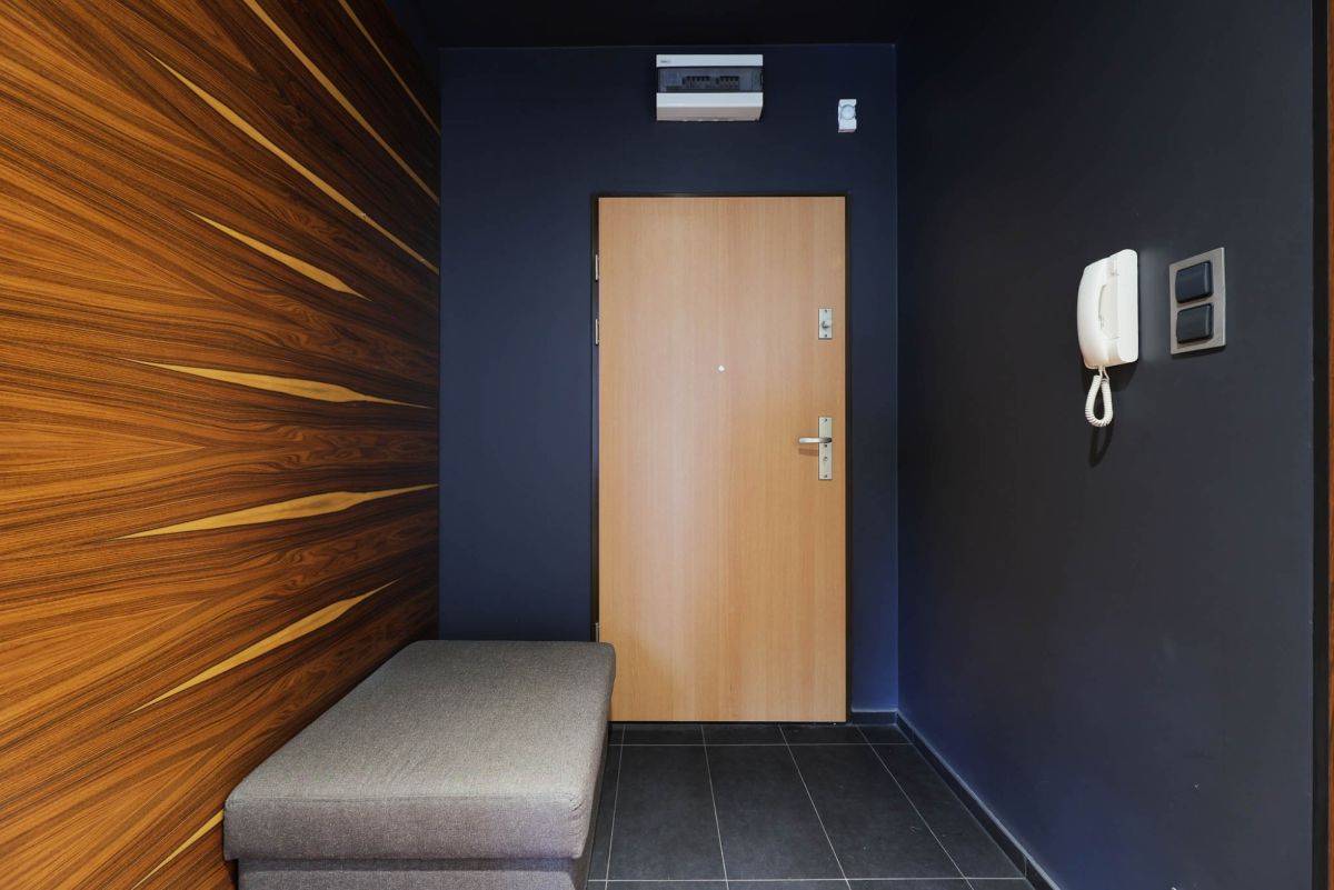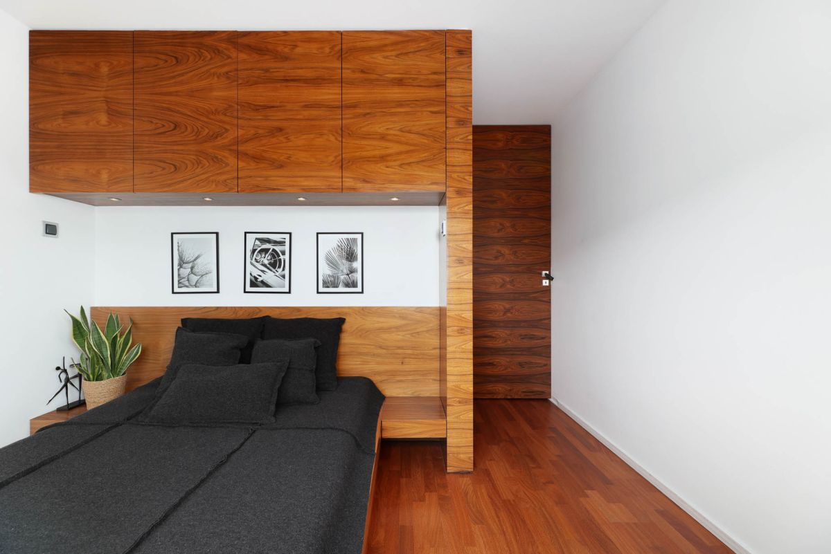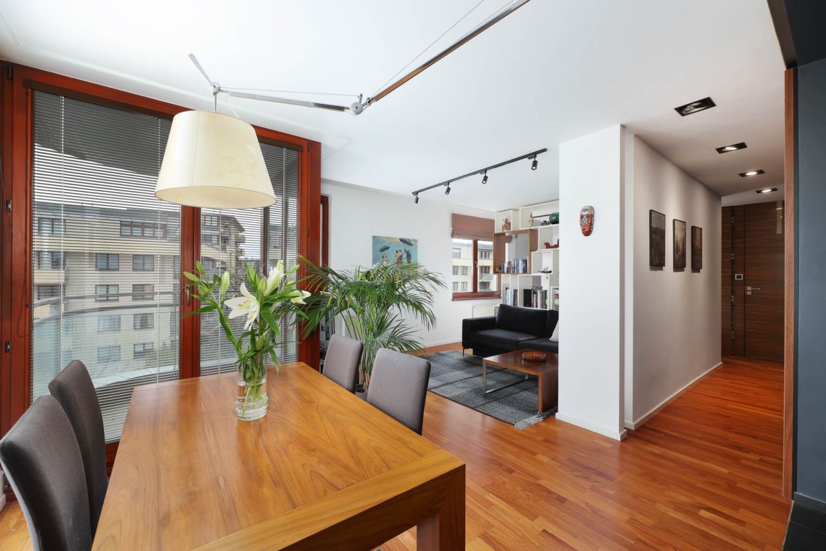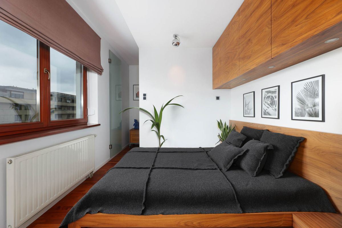 Wnętrze zostało wykończone w podwyższonym standardzie, z dbałością o jakość materiałów. W części kuchennej zastosowano blat z ciemnego granitu, a cała zabudowa została wykonana na wymiar z wykorzystaniem forniru palisandru indyjskiego. Na podłogach znajduje się drewniana podłoga Barlinecka, co nadaje wnętrzu elegancki i ponadczasowy charakter.