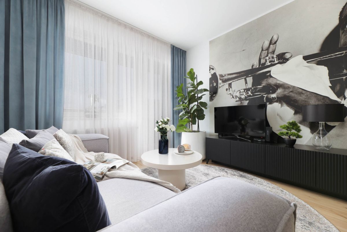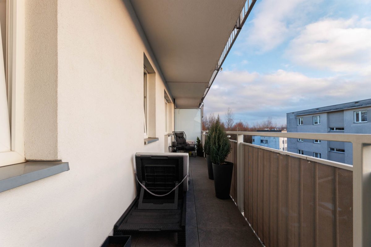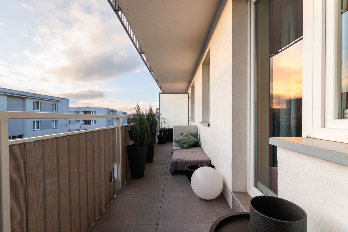 Wszystkie okna prowadzą na balkon, a ekspozycja południowo-zachodnia sprawia, że wnętrze jest bardzo dobrze doświetlone przez cały dzień.