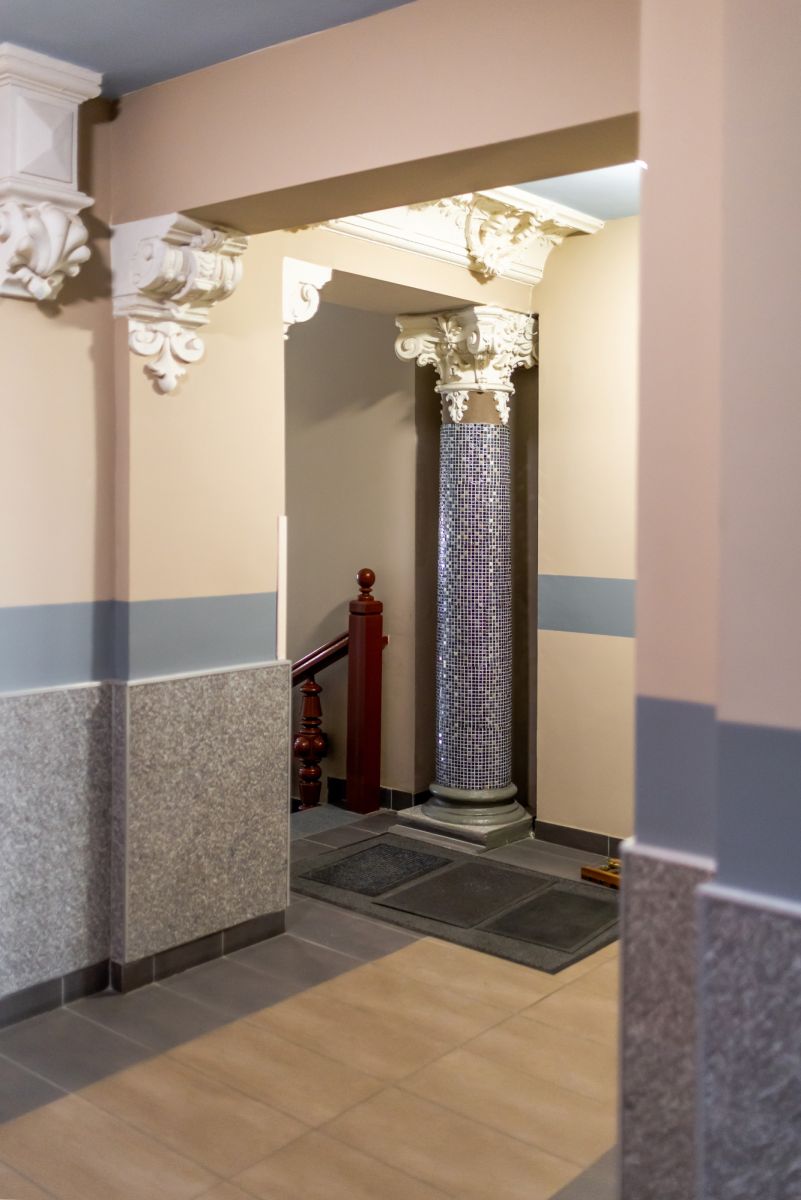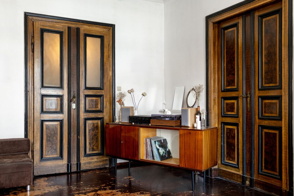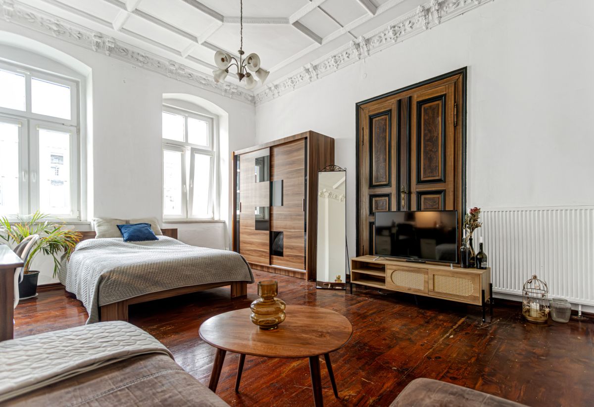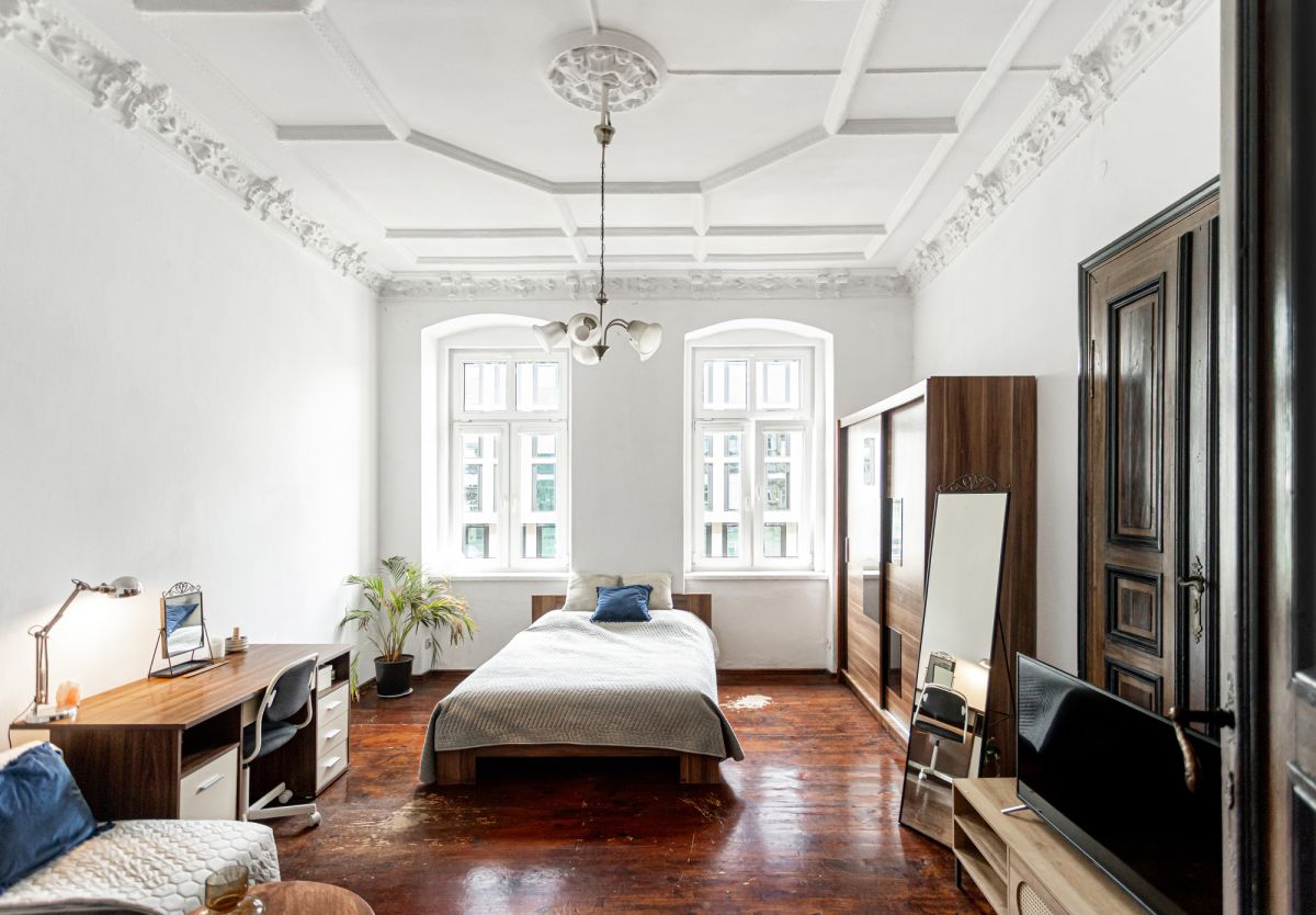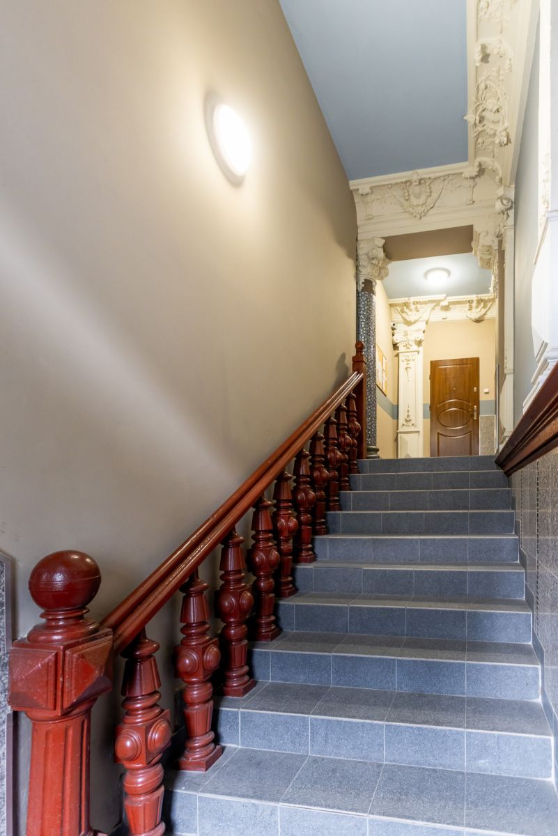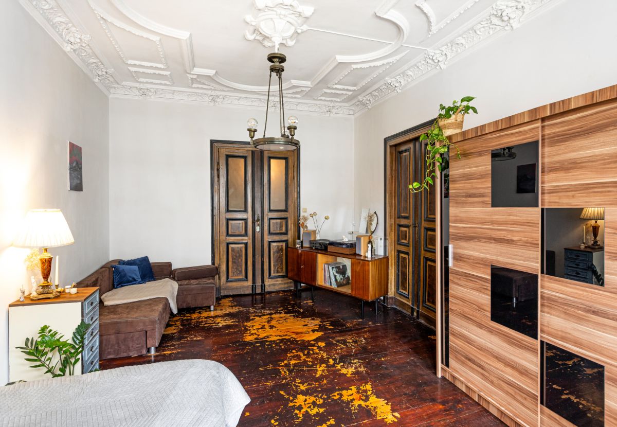 Mieszkanie znajduje się na 1 piętrze w 4-piętrowej kamienicy z pięknie odrestaurowaną klatką schodową i podwórkiem. Obecnie funkcjonuje jako dwa niezależne mieszkania po około 60 m2 każde, z osobnymi wejściami. Istnieje możliwość zakupu zarówno jako całość, jak i dwóch osobnych lokali. Wnętrza zachowały oryginalny, kamieniczny klimat — wysokie sufity (ok. 3,5 m), oryginalne drewniane podłogi i stolarka drzwiowa oraz ozdobne stiuki.